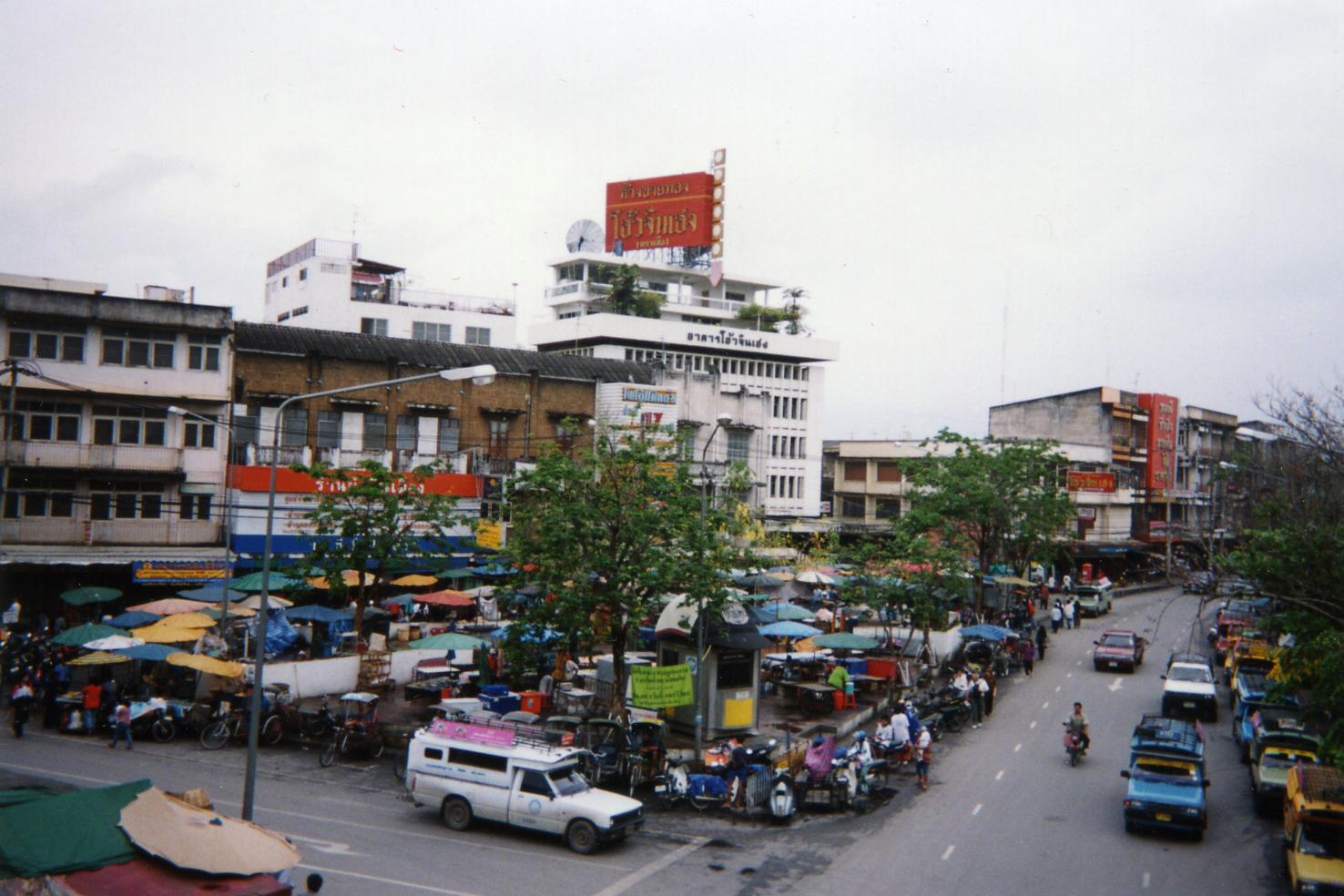 夕闇が下りてくると、南国と言ってもタイの最北辺のこと。半袖アロハじゃ肌寒い。ホテル前で網を張っていたトゥクトゥクをつかまえて(捕まえられて?)車の少ない道路を走るとき、風が冷たく宵闇も濃く、ちょっぴり不安な出だし。でも、トゥクトゥクは10分走って街の中心・バスターミナル横のナイトマーケットに到着した。